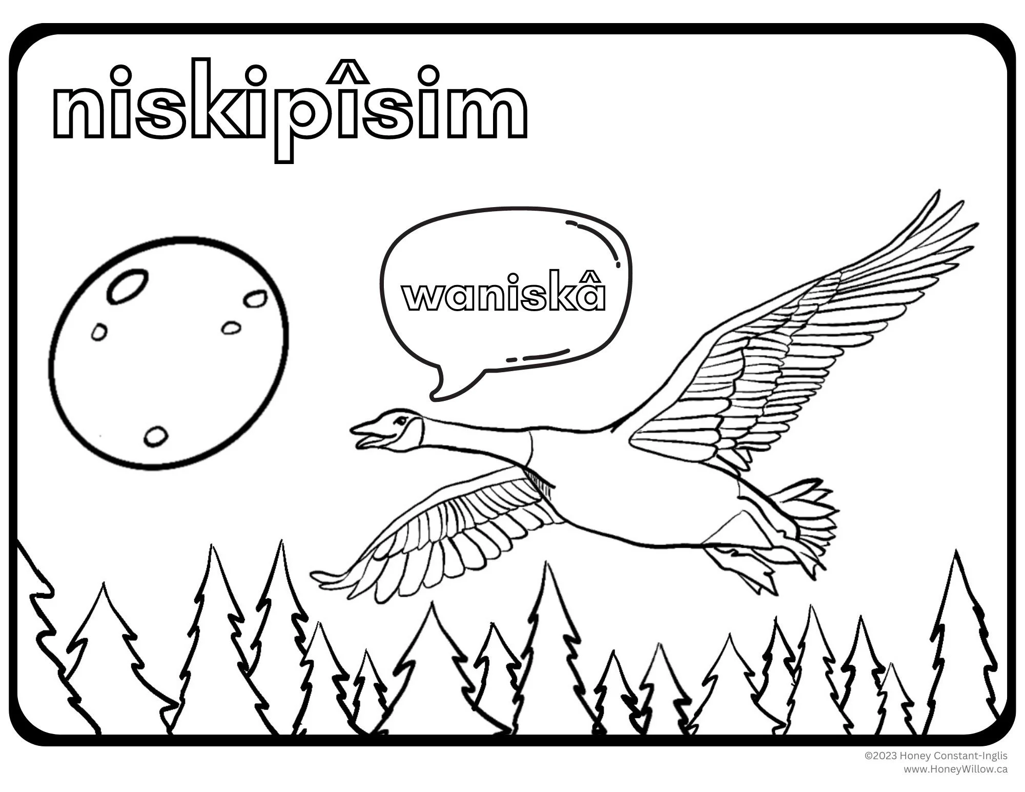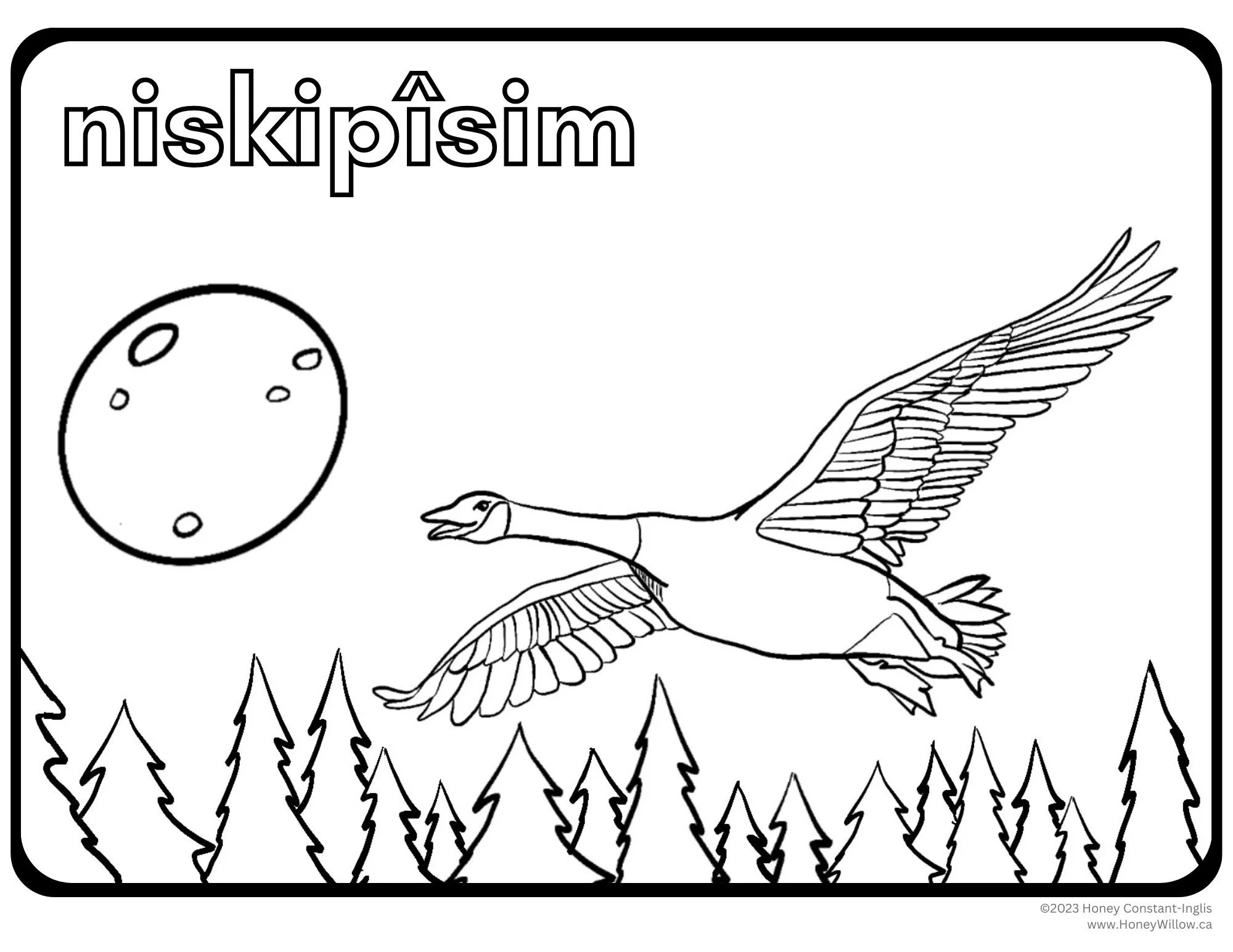 niskipîsim, translated to “Goose Moon” refers to the month of March. Named for the return of the geese, March marks the start of Spring. Choose between the “waniskâ” colouring page where the niska is waking up the plants and animals, or just the goose themselves.